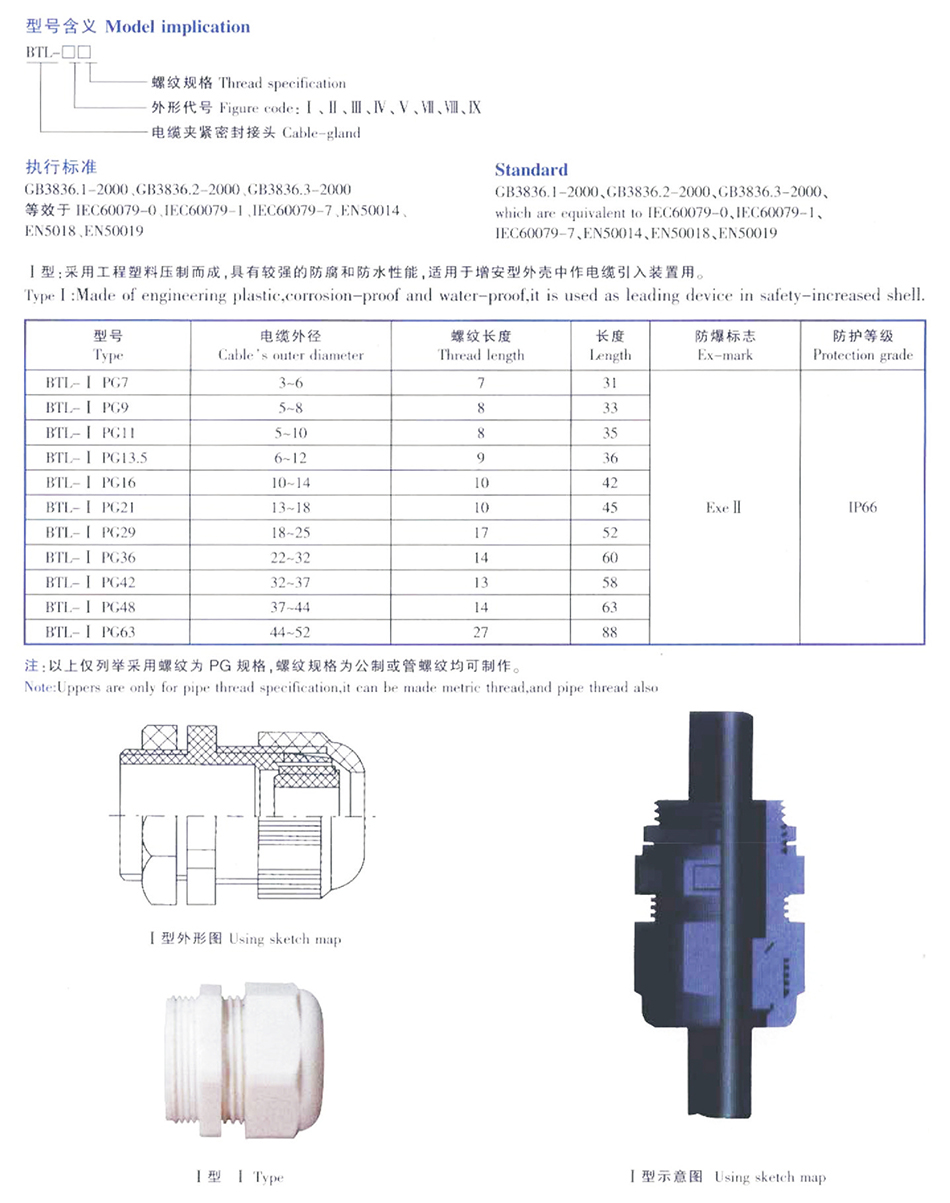 Ⅰ型:采用工程塑料压制而成,具有较强的防腐和防水性能,适用于增安型外壳中作电缆引入装置用。